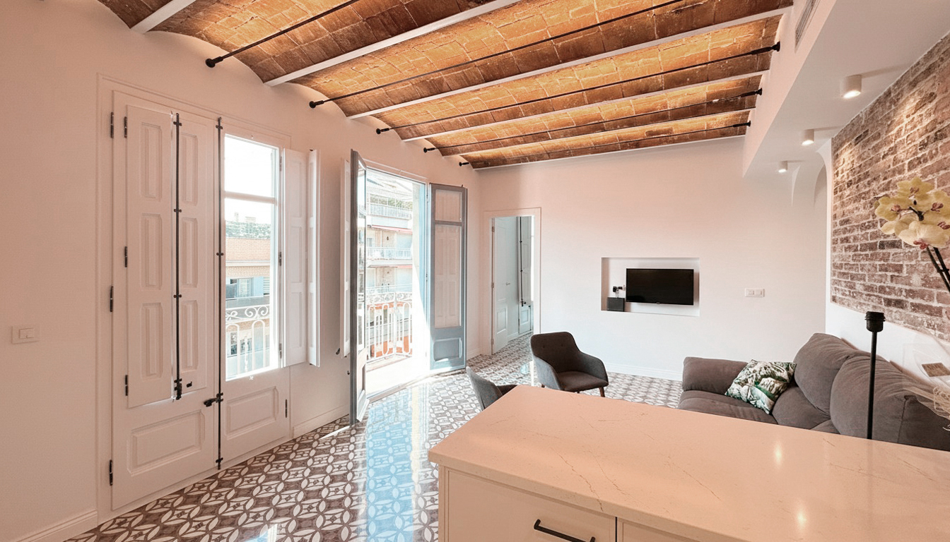 Uno de los elementos más destacados fue la recuperación del pavimento hidráulico original, que aporta carácter y autenticidad al espacio, combinándose con nuevos acabados que suman frescura y modernidad. También se restauraron balconeras y forjados, con el objetivo de preservar la esencia del edificio y su valor arquitectónico, aportando continuidad entre lo existente y lo renovado.